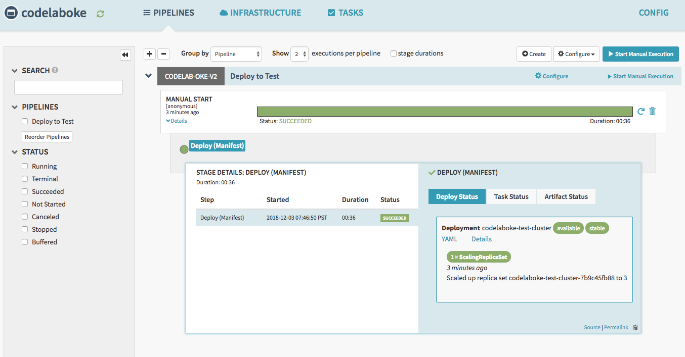 Run a “Start Manual Execution” in “Deploy to Test” to Test pipeline.